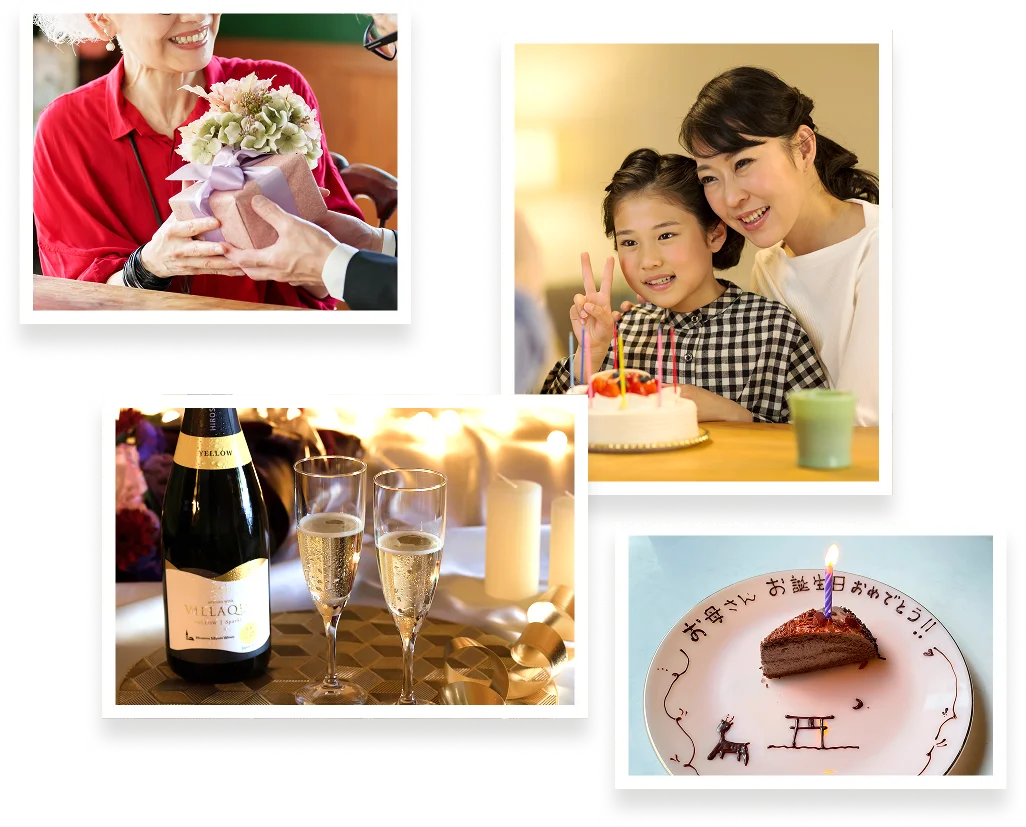誕生日や結婚記念日をはじめ、母の日、父の日、還暦祝いなど、さまざまな節目のシーンを彩ります。ケーキやシャンパンのご用意はもちろん、スタッフによる心を込めたおもてなしで、特別な一日をより思い出深く演出します。