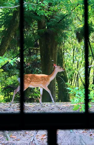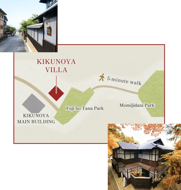 The villa stands diagonally across from the main building, quietly nestled in a peaceful, green setting. In spring, cherry blossoms bloom; in autumn, the surroundings are colored with autumn leaves, allowing you to feel the changing seasons up close. Deer may appear in the morning and evening. A shuttle service is available from Miyajima Pier.