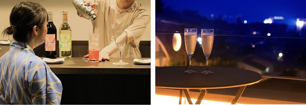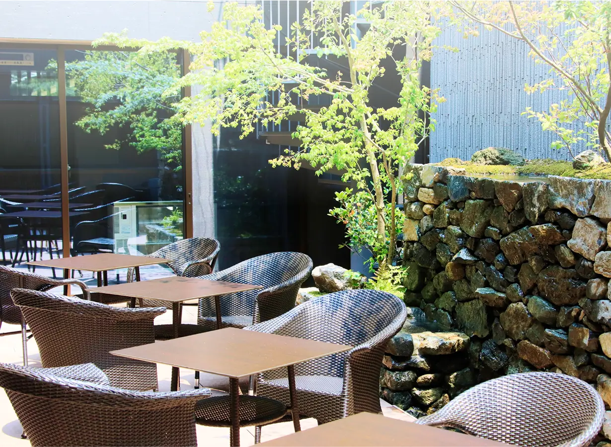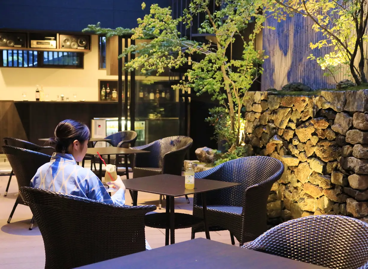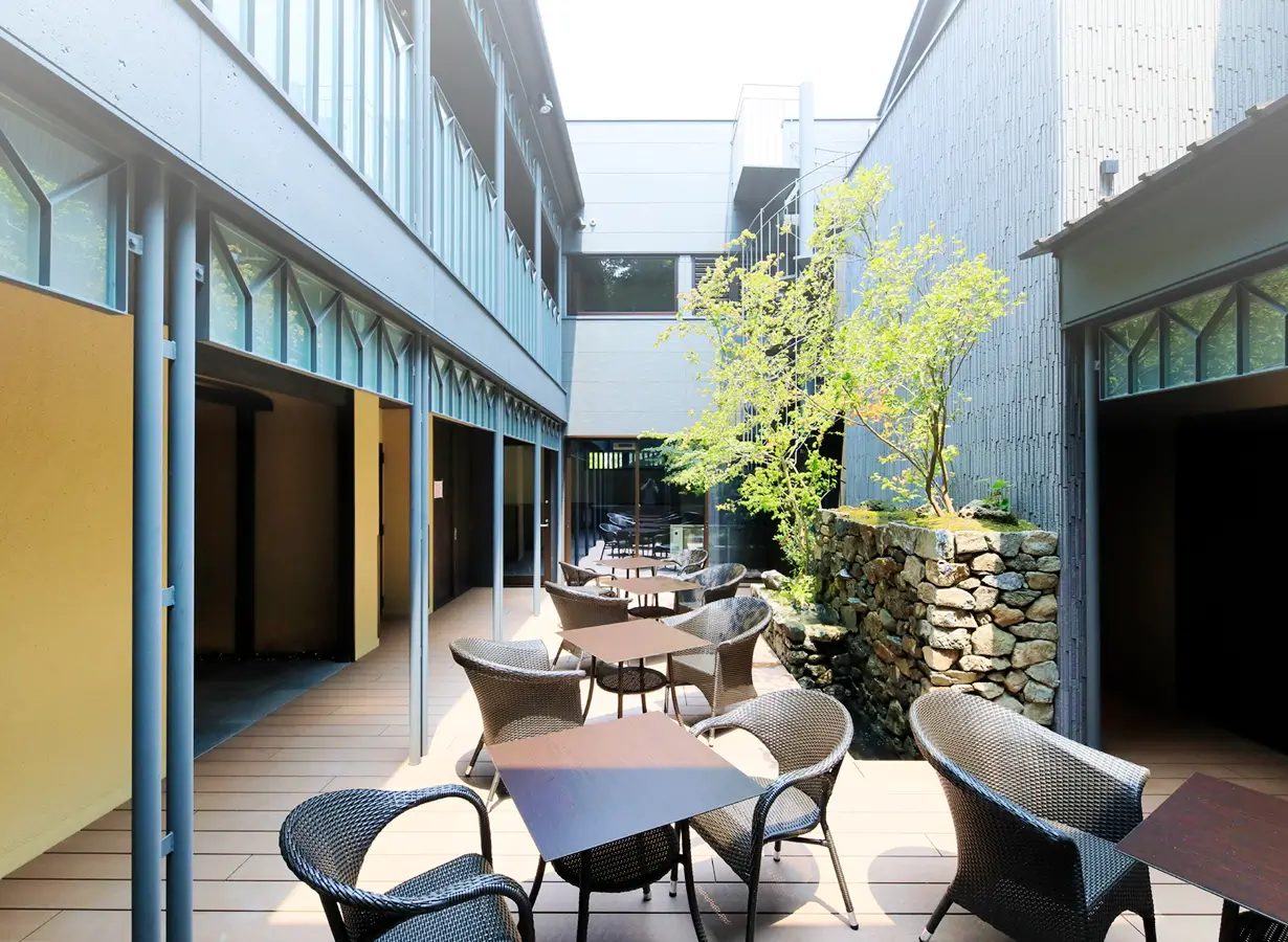 The courtyard at the heart of the building is a private space for guests only. Water flows softly through the trees and along stone walls, beneath blue skies and star-filled nights. Feel the breeze drifting down from the primeval forests of Mount Misen, and relax on the terrace while enjoying complimentary drinks at your leisure.