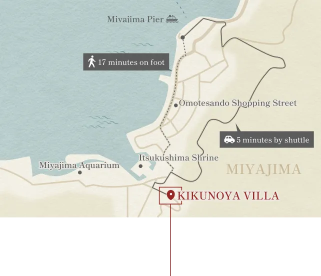 | Information for Guests | ・We offer 3 room types with different views and locations; room requests cannot be accommodated. ・For stays of 3 guests, a sofa bed will be provided. ・The villa is available to guests of junior high school age and older only. ・The rooms do not offer views of the sea, Itsukushima Shrine, or the Great Torii Gate. |