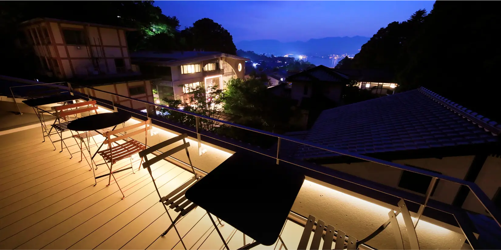 A rooftop terrace overlooking the streets of Miyajima and the Seto Inland Sea.