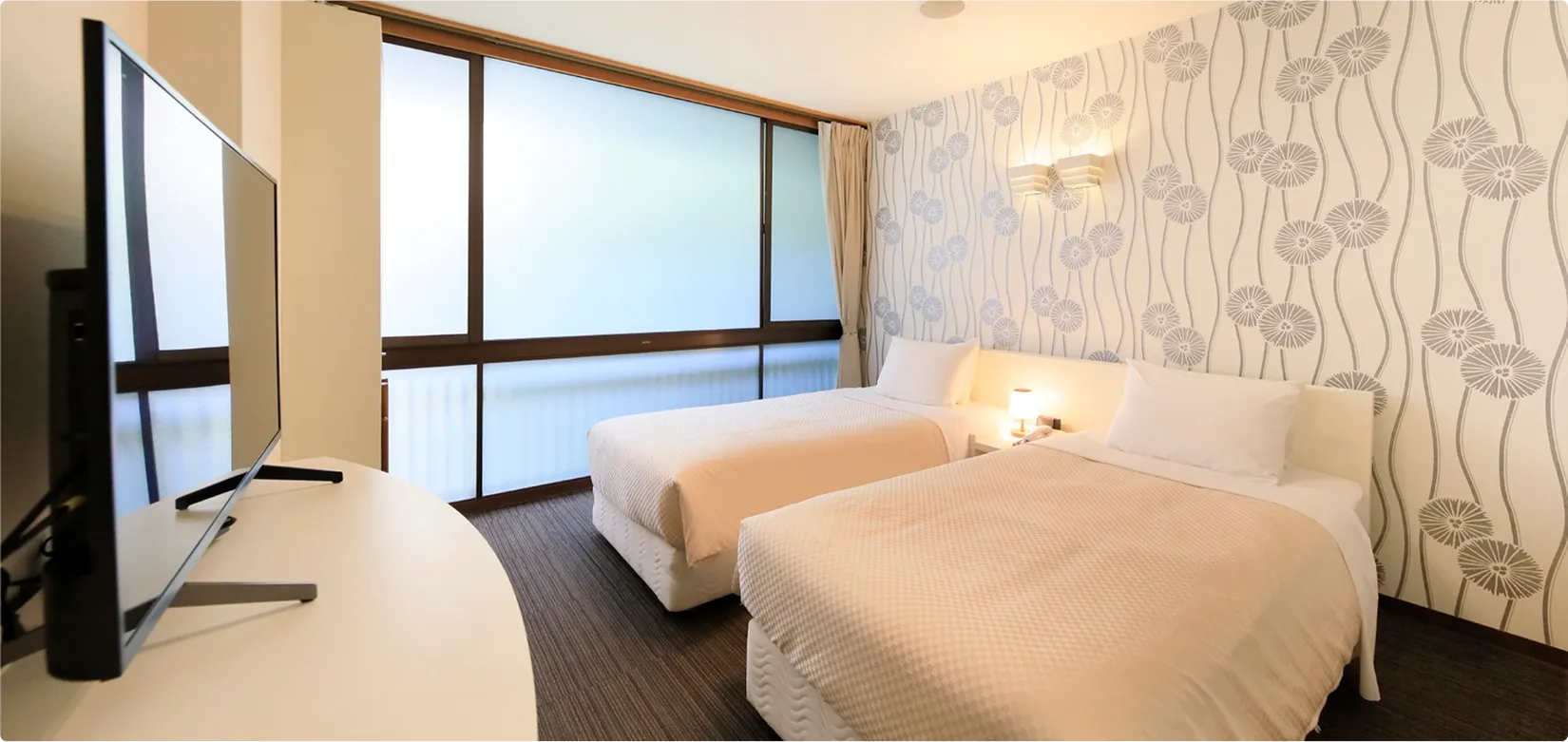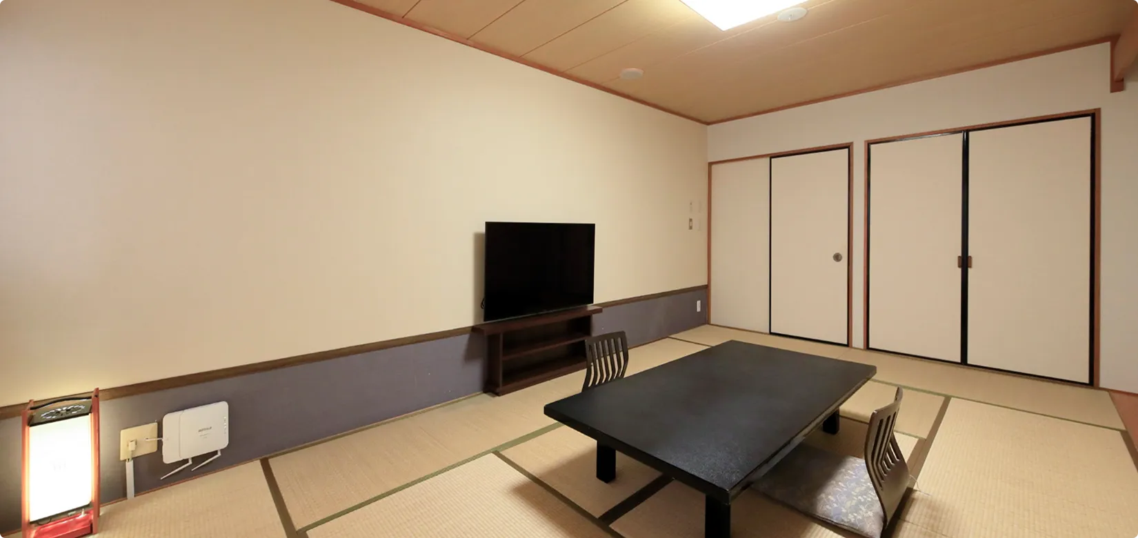 | 個別設備 | バスなし・トイレ付(大浴場をご利用いただけます)、ネット対応43型液晶テレビ、空気清浄機能付きエアコン |